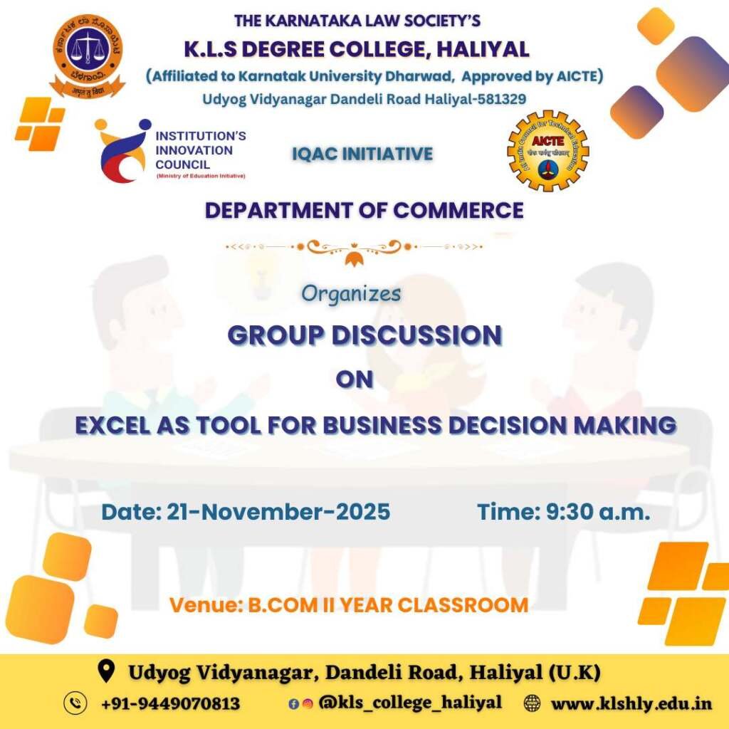A Group Discussion session on “Excel as a Tool for Business Decision Making” was conducted for B.Com III Semester students.The aim of this discussion was to explore how Excel can be effectively used as a tool for business decision-making.The session was highly interactive, and all the participants were excited to share their opinions about the use of Excel spreadsheets in business decision-making.