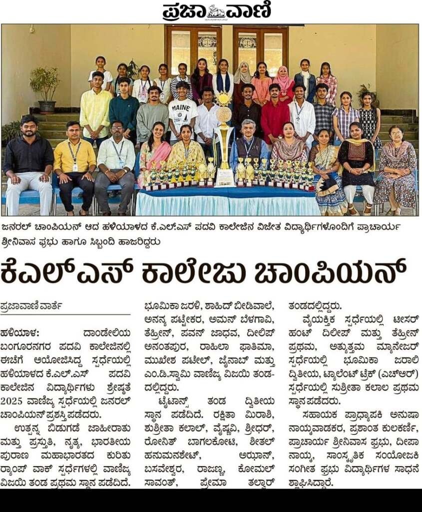 KLS Degree College Students Win General Championship. KLS Degree College students participated in a two-day Intra-College Fest Eminence 2025 held on 16th and 17th December 2025 at Bangur Nagar Degree College, Dandeli. Our students took part in various competitions and showed excellent performance. They won the General Championship Trophy.