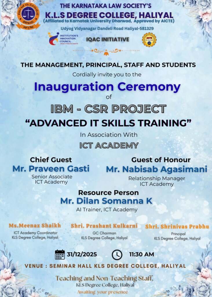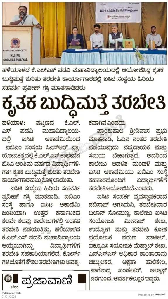 The ICT Academy at KLS Degree College, Haliyal, organised a five-day training workshop(29-12-2025 to 2-5-2026) on Artificial Intelligence for final-year students under the CSR sponsorship of IBM.Inaugurating the programme, Praveen Gasti, Senior Associate, ICT Institute, highlighted the importance of skill-based training alongside academic courses. Presiding over the programme, Principal Srinivas Prabhu said that such training helps students save time and cost after completing their studies.ICT Liaison Manager Nabisab Agasimani, Trainer Dilan Somanna, College ICT Coordinator Meenaz Shaikh, and other faculty members were present.